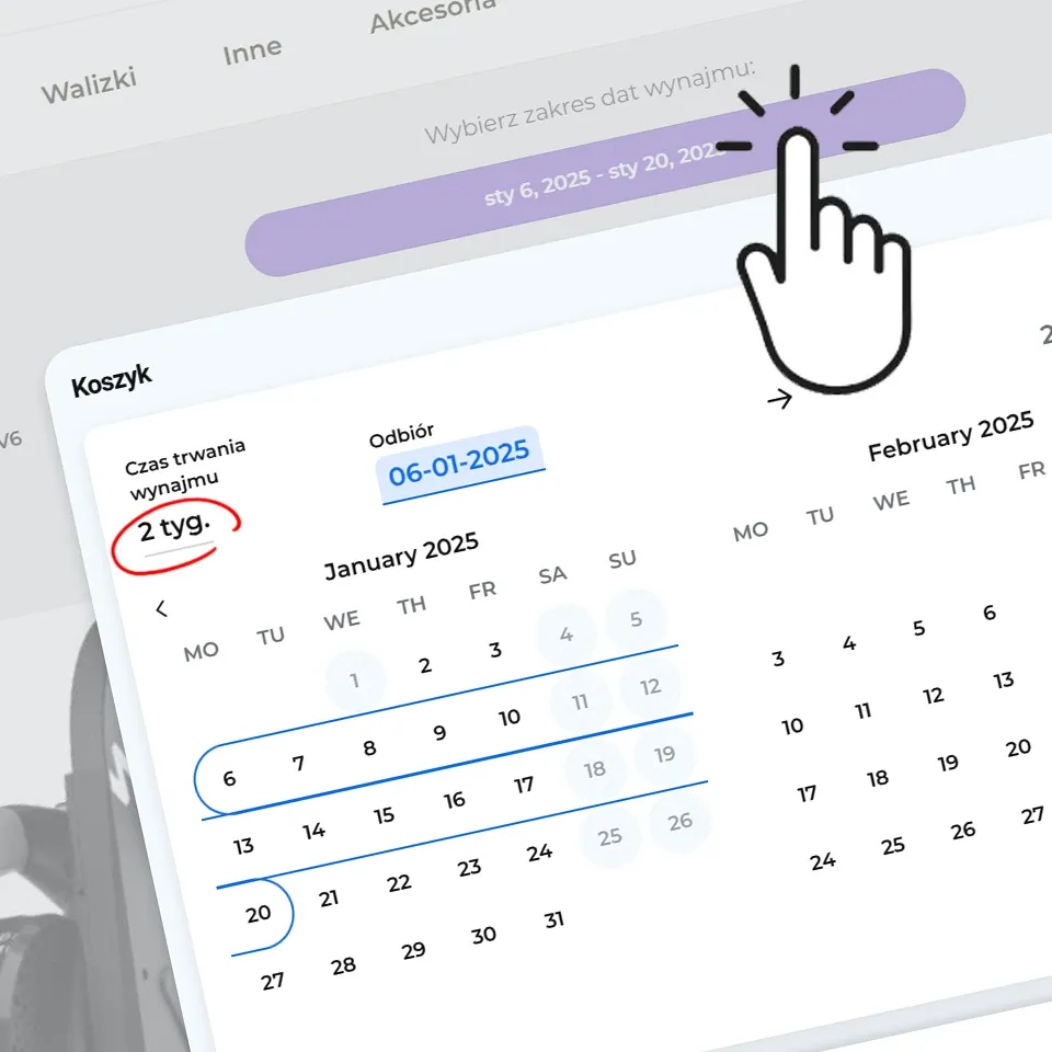 W polu wyboru zakresu dat, wybierz interesujący Cię okres wynajmu - datę początkową i końcową z kalendarza. W przypadku wynajmu z wysyłką okres najmu liczymy od nadania do nadania, a więc jeśli chesz mieć sprzęt u siebie danego dnia, upewnij się, że rozpoczynasz najem dzień wcześniej, abyśmy zdążyli wysłać zamówienie. Opóźnienie przesyłki zwrotnej bierzemy już na siebie.